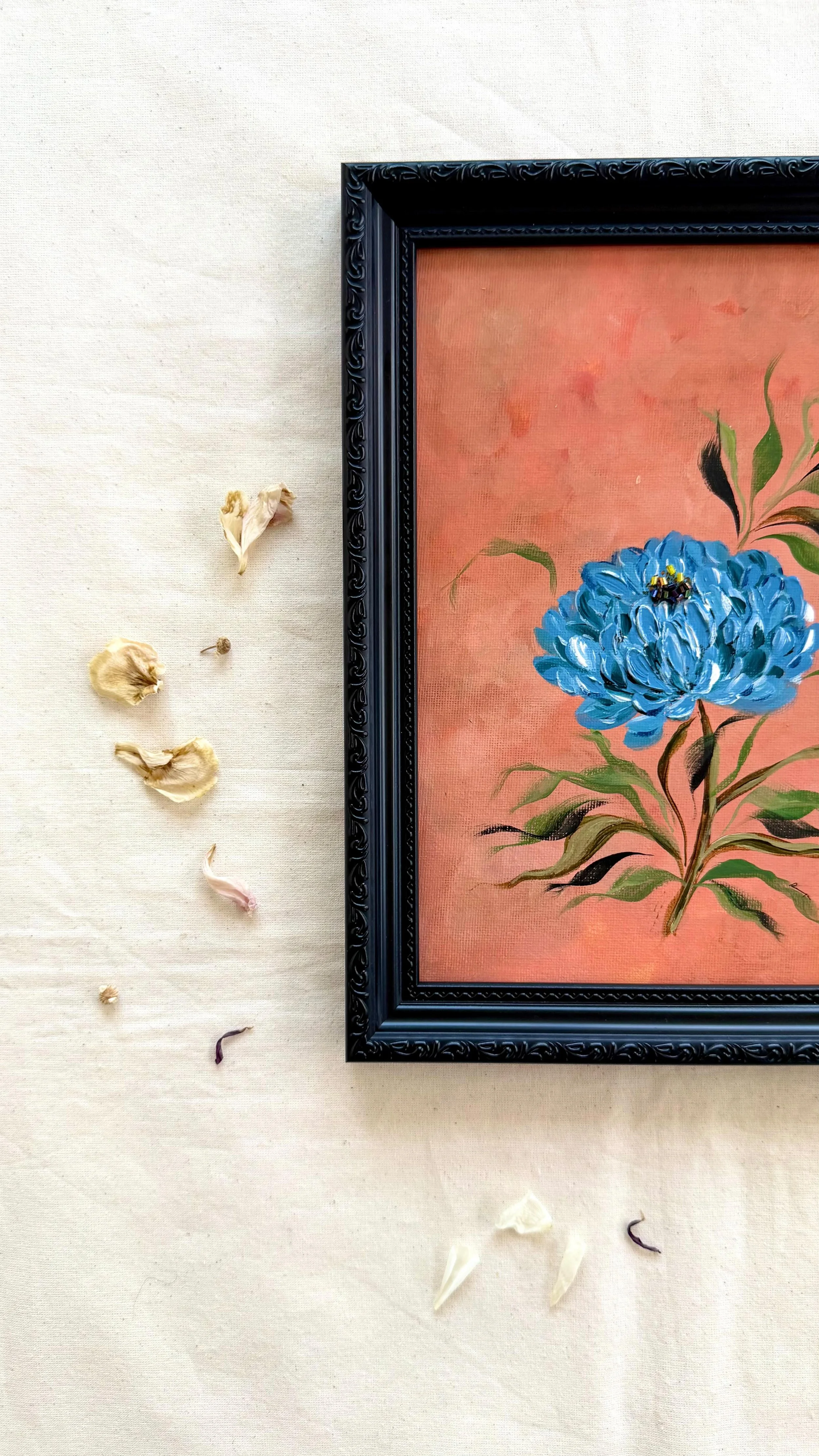 Ramya’s work is rooted in her desire to live a light, carefree, and joyful life. She creates art that reflects this aspiration, with each piece soaked in dreamy colors and layered petals, representing qualities we all seek, strength, calm, boldness, and a breath of fresh air.